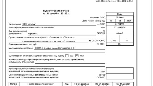 Бухгалтерский баланс за 2023 год Бухгалтерский баланс — первый и основной финансовый документ из комплекта годовой бухгалтерской отчетности за 2023 год. По нему можно судить о финансовом положении компании, увидеть, какими активами обладает фирма, каковы ее капитал и обязательства. Это форма по ОКУД 0710001, утвержденная приказом Минфина России от 02.07.2010 № 66н. В последний раз она менялась с 01.06.2019 (приказ Минфина от 19.04.2019 № 61н), так что хорошо нам знакома. В действующем формуляре бухгалтерского...