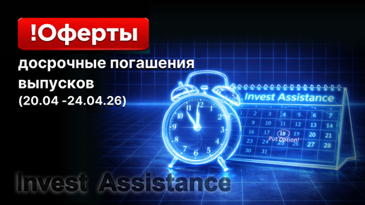 Коллеги публикуем информацию о предстоящих офертах, период предъявления заявок на участие в которых пройдет на следующей неделе: Put-оферта 27.04.2025 Период предъявления: 20.04.2026 – 24.04.2026 Количество выкупаемых бумаг - до 100 042 штуки. Цена приобретения - 99,50% от номинальной стоимости. Put-оферта 27.04.2025 Период предъявления: 16.04.2026 – 22.04.2026 Количество выкупаемых бумаг - до 1 657 штук. Цена приобретения бумаг - 100% от номинальной стоимости облигации. Put-оферта 27.04.2025 Период предъявления: 16...