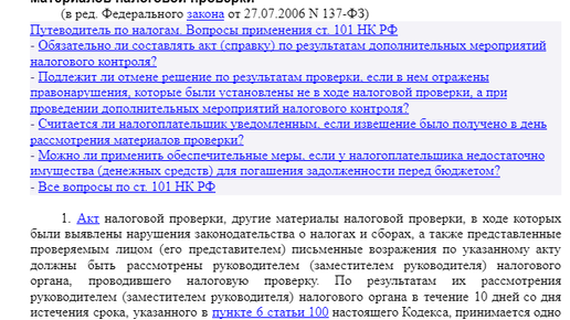 Статья 101 Налогового кодекса РФ «Вынесение решения по результатам рассмотрения материалов налоговой проверки» и входит в главу 14 «Налоговый контроль». Некоторые положения статьи: 1. Руководитель (заместитель руководителя) налогового органа рассматривает акт проверки, другие материалы, в ходе которых были выявлены нарушения законодательства о налогах и сборах, а также письменные возражения проверяемого лица (его представителя). В течение 10 дней со дня истечения срока, указанного в пункте 6 статьи 100 НК РФ, принимается одно из решений, предусмотренных пунктом 7 статьи, или решение о проведении дополнительных мероприятий налогового контроля...