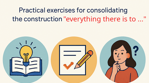 Практические упражнения для закрепления конструкции “everything there is to ...” Эта универсальная конструкция означает «всё, что только можно / что существует для...». Она помогает выразить полноту действия или знаний. Чтобы запомнить её лучше, давайте сразу перейдём к практике. (Смотрите теоретический материал в предыдущей статье) Exercise 1. Complete the sentences with the correct form of the verb (to know / to see / to do / to eat / to say). 1. My grandfather is a master carpenter; he taught me ________________ about working with wood...