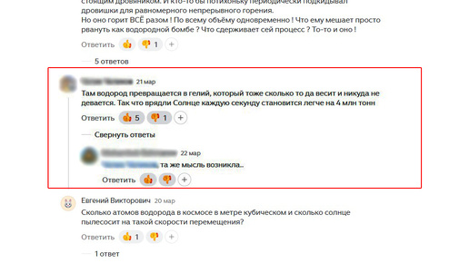 Сегодня давайте поговорим вот о чем… Недавно в комментариях был высказан такой тезис (скрин ниже) Автор коммента утверждает, что раз гелий тяжелее водорода, то Солнце, по идее, не должно терять массу. Я бы сказал даже наоборот, оно должно постепенно набирать вес, но почему-то этого не делает. Почему? Давайте разберемся. Итак, - атомный вес водорода (H) — 1,008 а. е. м., - атомный вес гелия (He) — 4,002602 а. е. м. Видите разницу? Масса атома гелия больше массы атома водорода аж в 4 раза. И за 4 млрд лет Солнце должно было бы прилично так создать гелия, чтобы потяжелеть...