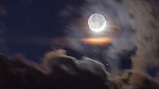 Дата: 2026-04-24 Автор снимка: Giorgia Hofer Озарённые солнцем рога молодого полумесяца, кажется, обнимают тёмную ночную сторону Луны на этом драматичном снимке, сделанном с планеты Земля. Что на этом кадре? Единая телеобъективная экспозиция была сделана ночью 19 апреля, когда двухдневная Луна находилась в перигее своей эллиптической орбиты. В ту же ночь молодая Луна оказалась на небе рядом с Плеядами - звёздным скоплением Семь Сестёр. Лунная корона: Млечный свет Плеяд собрался под ярким серпом...