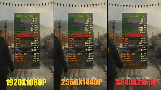 На YouTube-канале Jegs TV протестировали в 10 играх сборки с видеокартами RTX 4070 Ti, 4070 Ti S, 4080 и 4080 S. Baldur’s Gate 3 шла ультра-пресетом, Native Resolution. В 1080p в этой игре в среднем удалось получить 256 к/с (RTX 4070 Ti), 266 к/с (RTX 4070 Ti Super), 314 к/с (RTX 4080) и 315 к/с (RTX 4080 Super), в 1440p — 176, 180, 217 и 217 к/с соответственно, в 4К — 85, 89, 107 и 108 к/с соответственно. Palworld запускалась с Epic Preset, No Upscaling. В среднем в разрешении 1080p в ней FPS равнялся...