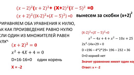 Сегодня разберем уравнение 4-й степени, которое решается нестандартным приёмом — переходом к системе квадратных уравнений. Решите уравнение (x² - 36)² + (x² + 4x - 12)² = 0 Проанализируем представленное уравнение. По сути, оно имеет вид Y² + Z² = 0, где Y = x² - 36, Z = x² + 4x - 12. Иными словами, это сумма квадратов каких-то выражений, которая равна нулю. Как известно, квадрат любого выражения неотрицателен, следовательно, сумма может быть равна нулю только в одном случае — когда оба слагаемых равны нулю одновременно...
