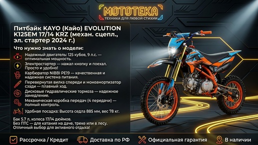 Коллеги, технические данные по питбайку KAYO EVOLUTION K125EM (17/14, KRZ, 2024 г.). 🔹 Двигатель: 1P54FMI, 125 см³, 4-тактный, 1 цилиндр, мощность 9 л.с., воздушное охлаждение. 🔹 Питание: Карбюратор NIBBI PE19. 🔹 Трансмиссия: Механическая, 4 передачи (N-1-2-3-4). 🔹 Стартер: Электро. 🔹 Колеса: 17/14 дюймов. 🔹 Тормоза: Дисковые гидравлические (перед/зад). 🔹 Подвеска: Передняя — перевернутая телескопическая 770 мм, задняя — моноамортизатор 360 мм (оба нерегулируемые)...