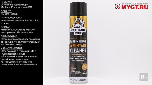 Продукт: Очиститель карбюратора Mechanic Pro аэрозоль 650ML Наш телефон: 8-800-550-57-22 ПН-ПТ 9.00-17.00 (МСК+4) Артикул: AC-650 - 650ML Производитель: по лицензии Mechanic Pro Inc U.S.A в Китае Состав: Метанол 40%, бутан/пропан 20%, дихлорметан 25%, толуол 15% В процессе эксплуатации автомобиля, происходит постепенное загрязнение карбюратора. Это приводит к затруднению пуска и падения мощности двигателя, ухудшению разгонной динамики, перерасходу бензина. Использование аэрозольного...