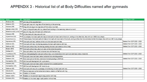 Все именные элементы, которые числятся в правилах ХГ Так свое имя в истории уже оставили Россия: Амина Зарипова, Алина Кабаева, Ляйсан Утяшева, Ольга Капранова, Зарина Гизикова, Дарья Трубникова, Лала Крамаренко, Евгения Канаева Италия: Александра...