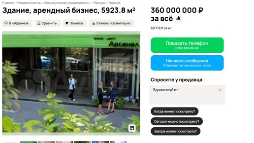 На одном из сайтов объявлений появилось предложение о продаже бизнес-центра «Арсенал», расположенного в самом сердце Воронежа на улице Арсенальной, 3. Стоимость объекта составляет 360 миллионов рублей. Общая площадь здания – 5 923,8 квадратного метра. В него входят пять этажей и цоколь с высотой потолков три метра. Земельный участок площадью 26,26 сотки находится в собственности, а на прилегающей территории оборудована парковка на девяносто машино-мест. Здание оснащено современным лифтом, подключено девять провайдеров, выполнен дизайнерский ремонт, проведены все необходимые коммуникации...