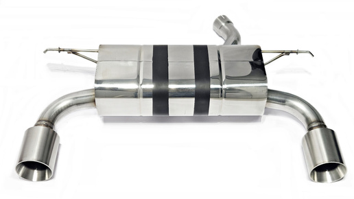 Задняя часть выхлопной системы для семейства автомобилей BMW 3-й серии 340i (F30, 31 рестайлинг) с двигателем B58B30 3.0 л, 326 л.с. Глушитель и насадки серии Performance. Глушитель выполнен полностью из нержавеющей стали AISI 304, в том числе и внутренняя, цельная перфорированная труба.