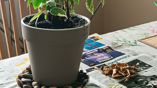 15 апреля 2026 года Здравствуйте, друзья! Свой фикус по имени Бенджамин я купила в соседнем магазине "Оазис" года четыре назад. Какого он был тогда размера, точно не помню. Наверное, маленький. Сразу пересадила его в горшок побольше, поливала от одного (зимой) до трёх (летом) раз в неделю и на этом всё. Пересадить ещё раз всё собиралась, но весной забывала, летом не решалась, а осенью-зимой тем более. Так и рос бедняга в тесном горшке, без особого ухода. К тому же переживал мои отлучки на неделю-другую...