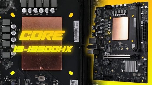 Это платформа для мобильных устройств на настольных компьютерах, поэтому процессор предустановлен, а не установлен в сокет. Core i9-13900HX — это чип Raptor Lake HX с 24 ядрами, 32 потоками , 36 МБ кэш-памяти L3, максимальной тактовой частотой в режиме Turbo Boost 5,4 ГГц и TDP 55 Вт. Материнская плата имеет форм-фактор M-ATX размером 237 × 184 мм...