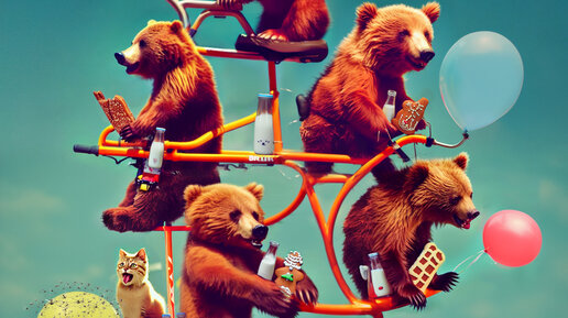 Ехали медведи На велосипеде. А за ними кот Задом наперёд. А за ним комарики На воздушном шарике. ... Едут и смеются, Пряники жуют. Создано при помощи нейросетей Midjourney и Stable Diffusion. Эта работая является продолжением или переосмыслением моей предыдущей, но в этот раз получилась более сложной в исполнении. Процесс: Когда я делал иллюстрации для прошлого поста с помощью нейросети Midjorney, мне в одной из попыток был выдан результат который мне понравился по форме, но не подходил по реалистичности...