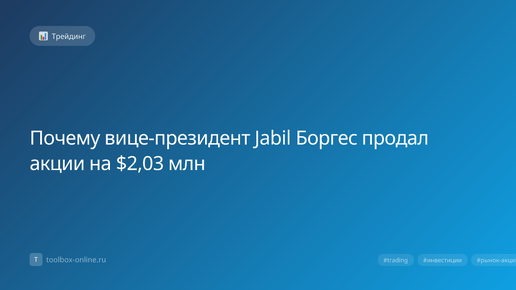Вице‑президент Jabil Боргес продал акции на сумму $2,03 млн, что по курсу 2026 года составляет примерно 180 млн рублей. Сделка была зарегистрирована 12 апреля 2026 года и указана в официальных SEC‑файлах. Продажа прошла через брокера Goldman Sachs и была оформлена как открытая инсайдерская сделка. Причина продажи — необходимость диверсификации личного инвестиционного портфеля и покрытие налоговых обязательств за 2025‑2026 финансовые годы. Боргес также упомянул в интервью, что хочет увеличить вложения в недвижимость и криптовалютные проекты...
