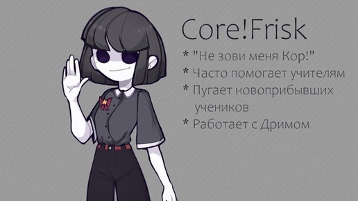 О персонаже Внешность: Core Frisk похож на оригинального Фриск, но всё его тело и одежда серых оттенков. Также у него отсутствуют глазные яблоки (на их месте два чёрных отверстия). История: Core Frisk до падения в подземелье жил на поверхности во время гражданской войны. В её ходе его родители погибли, после чего он решил уйти из родного города. Во время скитаний он попадает в Подземелье. После прохождения его в первый он повторяет это несколько раз. Санс, уставший от бесконечных перезапусков, сбросил Фриск в Ядро...
