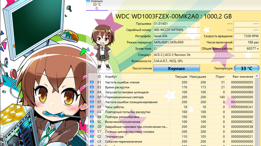 CrystalDiskInfo — бесплатная утилита с открытым исходным кодом, разрабатываемая программистом из Японии Нориюки Миядзаки (Noriyuki Miyazaki, ник hiyohiyo). Утилита предназначена для диагностики работы жёстких дисков и SSD. Выводит общую информация о дисках, проводит мониторинг значений S.M.A.R.T., осуществляет постоянный контроль температуры дисков. Главное окно утилиты отображает установленные жёсткие диски, общую информацию выбранного диска (техническое состояние и температуру) и его S.M.A.R.T...