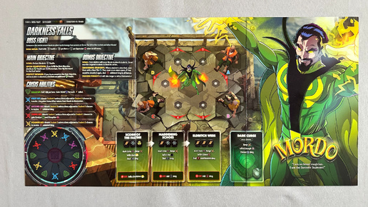 Миссия DARKNESS FALLS НАСТУПАЕТ ТЬМА БОЙ С БОССОМ! Сторона 1 Дормамму послал своего слугу Мордо собирать мистическую энергию у колдунов в Камар-Тадже. Защитите учеников и победите Мордо. НАСТРОЙКА БОССА: Начните с 50 +20 здоровья на героя + 3 за жетон Угнетения на всех героях. ГЛАВНАЯ ЦЕЛЬ ЦЕЛЬ: Уменьшить здоровье Мордо до 0. ПОСЛЕ ВЫПОЛНЕНИЯ: Если вы выполните главную задачу, распределите 4 здоровья и 3Ⓜ️. Затем переверните игровое поле для финальной битвы! ИДЕАЛЬНАЯ НАГРАДА: Если ваша команда выполнит главную задачу и ни один ученик не будет поглощён, распределите дополнительно 4 здоровья...