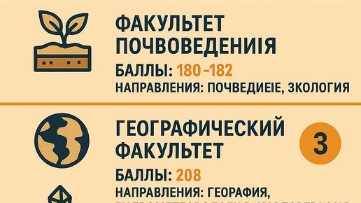 Данные основаны на приемной кампании 2024 года и прогнозах на 2025 год. Проходной балл 2024: 221 балл1 Направления: Особенности: Узкопрофильная подготовка с акцентом на экологический мониторинг и управление природопользованием2. Бюджетных мест — до 25 (6 мест на экологию и природопользование, 12 мест на биологию почв)2. Конкурс: 4,25 человека на место1 Проходной балл 2024: от 262 баллов3 Направления: Особенности: Обязательные летние экспедиции после 1-3 курсов3. Программы включают ландшафтное планирование, геоэкологию нефтегазовой отрасли, региональную политику3...