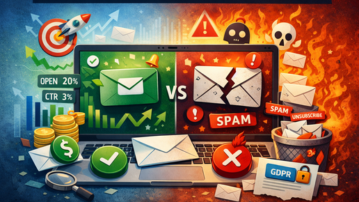 Одни считают email-маркетинг бесполезным пережитком прошлого, другие называют его самым стабильным каналом продаж. Коротко разберу, что сегодня происходит с рассылками, какие показатели считаются нормальными в 2026 году и почему, несмотря на законы и ограничения, в B2B от него не спешат отказываться. Email-маркетинг — это системная работа с клиентами через письма: рассылки, автоматические цепочки, триггерные сообщения и прогревы. Это не «разослали всем одно письмо», а: Если этого нет — это действительно спам...