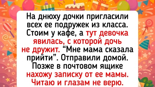 В эпоху мессенджеров обычная бумажная записка стала настоящим реликтом прошлого, но тем интереснее ее получить. Сегодня в программе — официантка, предостерегшая девушку от коварного кавалера, преподаватель с необыкновенным чувством юмора и милая записка от пятилетки, которая спасла маму от аврала на работе. На днюху дочки пригласили всех ее подружек из класса. Стоим у кафе, а тут девочка явилась, с которой дочь не дружит. «Мне мама сказала прийти». Отправили домой. Позже в почтовом ящике нахожу записку от ее мамы...