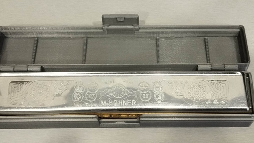 Продолжаю создавать нужные мне вещи. Имеется гармошка губная HOHNER Orchestra BRAVO, диатоническая, тремоло, оркестровая, 48 нот, тональность C-major. Покупалась в комплектации "без футляра". Решил устранить недостаток музыкального инструмента и сделать таки уже ему футляр. И сделал. Видео лежит здесь: https://disk.yandex.ru/i/_BGOczm863pZUA Особенности конструкции Вид с разнесенными частями: Пластик - серый PET-G производства ФД-пласт. Вставка на крышке - черный PET-G производства ФД-пласт. Печаталось соплом 0...