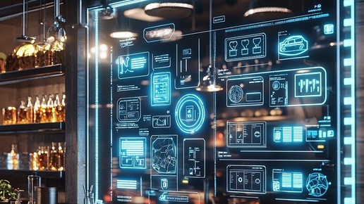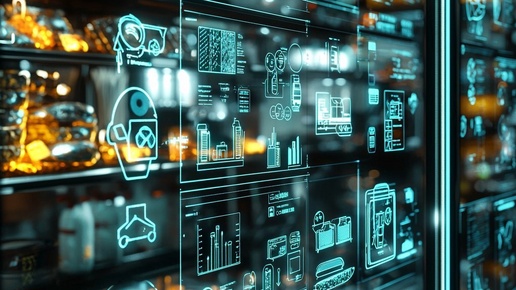 Создано на основе запроса: image of an automated food inventory and purchasing icons. hologram type. make sure it's modern and tech. background is restaurant's pantry. ar is 1:1 --- Автоперевод: Изображение автоматического инвентаризации продуктов питания и значков покупки...