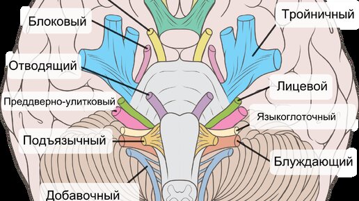 9 n. glossopharyngeus – языкоглоточный нерв. По функции – смешанный. Выходит, из мозга позади олив. Выходит, из черепа через яремное отверстие. Имеет три ядра: 1 Двойное ядро nucl. ambiguus, по функции двигательное, общее с блуждающим и добавочным нервами, проецируется в области нижней ямочки fovea inferior 2 Нижнее слюноотделительное ядро nucl. salivatorius inferior, по функции- вегетативное. Инервирует околоушную железу 3 Ядро одиночного тракта nucl. tr. solitarii, чувствительное ядро, общее для VII, IX и X пар черепных нервов...