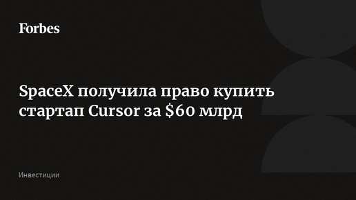 SpaceX Илона Маска (№1 в глобальном рейтинге миллиардеров Forbes, состояние, по данным Forbes Real-Time Billionaires на 22 апреля, — $785,5 млрд) получила право приобрести стартап в сфере искусственного интеллекта Anysphere, разработчика редактора кода Cursor, за $60 млрд, пишут Financial Times и Bloomberg со ссылкой на сообщение космической компании. Если сделка не состоится, SpaceX должна будет выплатить Cursor $10 млрд за «совместную работу». Фактически это одна из крупнейших в истории компенсаций за расторжение договоренностей, отмечает FT...