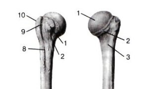 Плечевая кость, humerus, - длинная трубчатая кость. В ней различают диафиз – тело, corpus humeri, и два утолщенных конца – эпифизы: верхний – проксимальный и нижний – дистальный. Верхний конец утолщен и образует шарообразную головку плечевой кости, caput humeri. Головка обращена медиально и немного назад, отделена анатомической шейкой, collum anatomicum, от двух шероховатых бугорков. Один из них – меньший, tuberculum minus, другой – больший, tuberculum majus. От каждого из бугорков идут к телу кости шероховатые гребни – crista tuberculi majoris et crista tuberculi minoris...