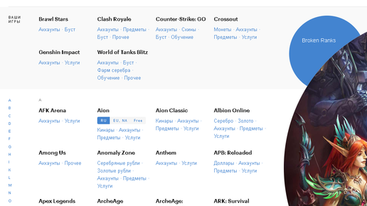 Начнем с меню: Здесь оно довольно удобное,выбери игру и услугу,все просто Для начала работы с сайтом нужно зарегистрироваться(удивительно),сделать это можно дав доступ к аккаунту ВК или зарегистрировав почту. Далее надо привязать номер,что удивительно, вам после регистрации не под каким предлогом не скажут какой у вас номер.даже запрос в ЦПП не помог...а жаль. С любой услуги,будь то продажа или покупка на сайте,берется комиссия,каждый раз разная,в среднем это будет 5 процентов,если игра загибается,то тут и меньше,зависит от кол-ва куплю/продам...