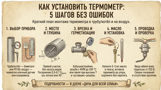 Для надёжного контроля температуры у себя дома и на участке я рекомендую три рабочих решения: стрелочный биметаллический термометр в гильзе для труб и котла, электронный термометр сопротивления Pt100 (или датчик с выходом 4-20 мА) для автоматики и цифровой комнатно-уличный термометр для воздуха в теплице и жилых комнатах. Схема установки у первых двух общая: гильза в поток, конец чувствительного элемента на оси или под 45° к потоку, глубина погружения 0,3-0,7 внутреннего диаметра трубы, в гильзу залить масло, кабельный ввод вниз...