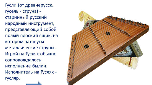 Гусли — русский народный струнный щипковый музыкальный инструмент, разновидностью которого является арфа, кифара, лира, псалтерий, жетыген..