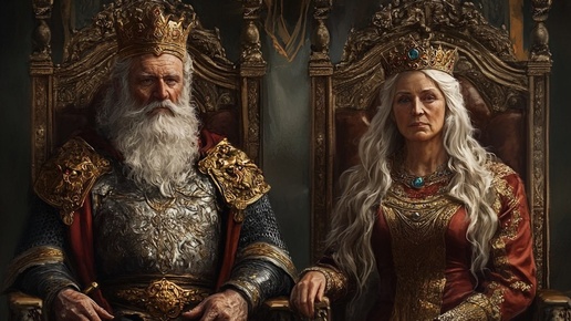 Создано на основе запроса: older Human male king and older female queen sitting upon thrones