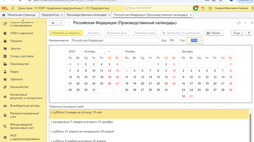Производственный календарь в Демо-версии 1С:ERP Управление предприятием 2