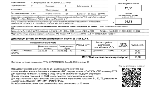 Есть Вход в личный кабинет частного клиента ПАО «ТНС энерго Ростов-на-Дону» страница: https://lk-rostov.tns-e.ru/auth/ Также есть Личный кабинет частного клиента ПАО «ТНС энерго Ростов-на-Дону» на странице: https://lk-rostov.tns-e.ru/?NEW_PERSONAL_ACCOUNT=612902010345 Вчера войдя в настоящий личный кабинет «Квитанции» страница: https://lk-rostov.tns-e.ru/receipt/ скачал следующее. СЧЁТ НА ОПЛАТУ МАРТ 2026г. Номер лицевого счёта: 612902010345. 0,00 руб. Расчёт в рублях за март 2026 г. по состоянию на 27...