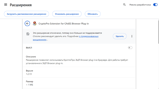 CryptoPro Extension for CAdES Browser Plug-in в Google Chrome – «Это расширение отключено, потому оно больше не поддерживается»