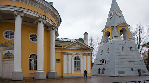 Если долго ехать на трамвае по проспекту Обуховской обороны от центра города, то вид, открывающийся с трамвайного кольца, может немало озадачить. За проспектом корпуса бывшего завода Большевик, с юга круг рельсов обрамляет дуга жилого дома 1970-х годов, а с севера среди тополей виднеется желтая ротонда необычного храма. С первого взгляда видно, что церковь с колокольней намного старее всего вокруг, и ощущения не обманывают. Во второй половине XVIII века эти земли, вместе с находящимся здесь селом Александровским, принадлежали генерал-прокурору князю А...
