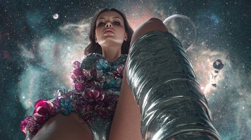 The camera is positioned inches from the ground looking up at a woman who dominates the frame. One foot, encased in a liquid chrome boot with a stiletto heel, is thrust forward towards the camera lens, creating a massive foreground element. The model's torso leans into the frame against a backdrop of a swirling nebula sky with floating chrome spheres. Her gown is an explosion of liquid silver and bioluminescent neon flowers that seem to grow in real-time. Lighting: Harsh bottom-up lighting (rim...