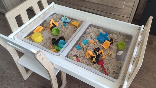 Приехав в строительный магазин и просто интуитивно выбрав пару контейнеров, дома я обнаружила, что это оказались абсолютно те же контейнеры, что были в комплекте со столиком. Вот ведь неожиданность! Когда мы выбирали столик и стульчик дочке, мы очень долго искали. Я рассматривала разных производителей: хочется купить красивую, качественную и удобную мебель. Решили остановиться на компании «Лимони Кидс», ведь было много плюсов, кроме одного минуса – цена. Их стол меня тогда очень подкупил – два больших контейнера внутри для сенсорных игр...