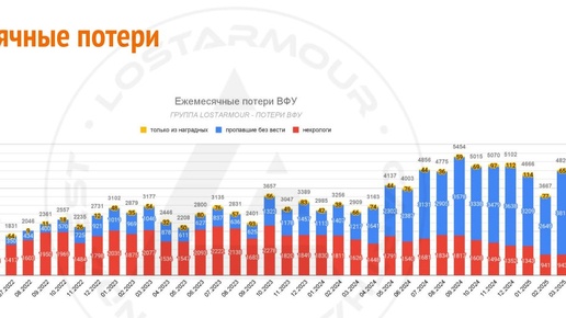 ЛостАрмор выпустили расширенную статистику по украинским потерям. PDF с картинками здесь: https://lostarmour.info/media/docs/ukr200-250507.pdf Сайт: https://lostarmour.info/ukr200 Кроме некрологов по ВСУ сейчас собирается статистика пропавших без вести. Это открытые данные от МВД, из которых можно вычленить погибших военных с некоторой погрешностью На сейчас в базе ЛА есть 68,5 тысяч некрологов и 62 тысячи пропавших. Итого минимальные потери ВСУ с начала войны — 130 тысяч убитых. Картинка 1: виден значительный рост потерь в статусе пропавших с одновременным снижением числа некрологов...