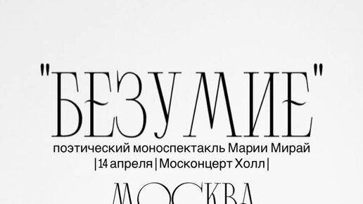 9 октября в концертном зале «Москонцерт Холл» прошла премьера музыкально-поэтической программы «Безумие» Марии Мирай — чтеца и поэтессы. Два отделения шоу были посвящены тому, что больше каждого из нас, тому, что неподвластно разуму. На сцене не было музыкантов, танцоров или спецэффектов. Один персонаж и множество вариантов линий судьбы. Зрители смогли прожить вместе с Марией весь спектр эмоций: радость, грусть, ностальгию, любовь...
