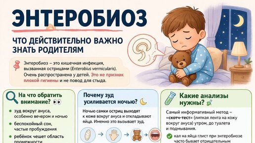 👇 «У ребёнка чешется попа ночью» — одна из самых частых фраз , которую я слышу от родителей. И чаще всего речь идёт именно об энтеробиозе — заражении острицами. ‼️: энтеробиоз — это не повод для стыда. Это очень распространённая инфекция у детей дошкольного и младшего школьного возраста. На что обратить внимание? 👀 🔹зуд вокруг ануса, особенно вечером и ночью 🔹беспокойный сон, частые пробуждения 🔹ребёнок чешет область промежности 🔹иногда — боли в животе, раздражительность, плаксивость 🔹у девочек возможно раздражение вульвы или выделения...