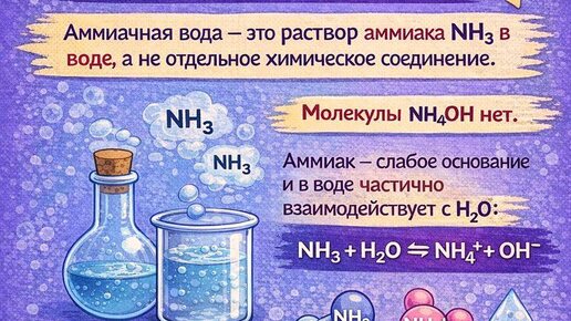 ❌ разбираемся без мифов В химии ЕГЭ очень любят эту ловушку. Пишут «гидроксид аммония» — а такой молекулы не существует. Что на самом деле называют «аммиачной водой» 👇 Аммиачная вода — это раствор аммиака NH₃ в воде, а не отдельное вещество. Молекулы NH₄OH нет. Почему? Аммиак — слабое основание и в воде частично взаимодействует с H₂O: NH₃ + H₂O ⇄ NH₄⁺ + OH⁻ Поэтому в растворе одновременно есть: • молекулы NH₃ • ионы NH₄⁺ • ионы OH⁻ • молекулы воды Но не существует единой молекулы NH₄OH...