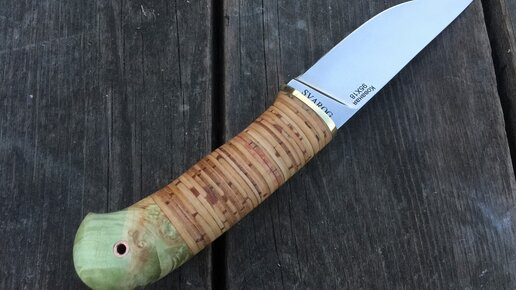 Еще одна новинка — нож «Егерь», рукоять — наборная береста, карельская береза. По внешнему виду — это шкуросъемный нож. Обух клинка — прямой, а режущая кромка резко поднимается вверх к острию, но и одновременно нож имеет северные корни. Рукоять выполнена в северном типе, на конце есть такой грибок, что позволяет при тычковых ударах комфортно удалять ладонью по тыльнику. Клинок выполнен из стали 95Х18, спуски начинаются от обуха и плавно переходят в режущую кромку, что обеспечивает прекрасный рез ножа...