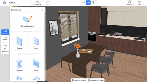 Мечтаете о кухне, где все на своих местах, а готовить — одно удовольствие? Попробуйте спланировать эргономичное пространство сами. В этой статье рассказали о шести бесплатных конструкторах кухни онлайн. Современный сервис для дизайна интерьера в 3D. В нем вы можете начертить полную планировку или оформить только кухню. Работа начинается с рисования стен. Их длина отображается прямо во время черчения. После на план добавляются окна, двери и элементы архитектуры: ниши, колонны. В каталоге мебели есть отдельный раздел с кухонными моделями...