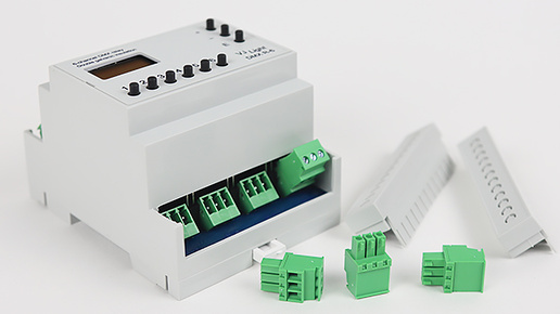 "VJight DMX R-6" - управляемое сигналом DMX переключающее реле с двойной гальванической развязкой для установки на DIN рейку имеет 6 DMX каналов управления и 6 трех-контактных разъемных клеммников для подключения электрической нагрузки. Данные реле оснащены OLED экранами, тремя кнопками меню и шестью кнопками управления реле в ручном режиме.