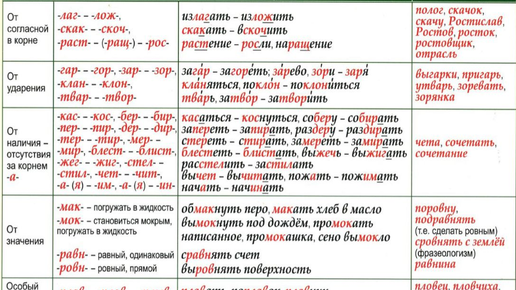Чередование гласных в корне — это замена одной гласной на другую в пределах одного и того же корня в разных формах слова. Написание гласных зависит от определённых условий: места ударения, наличия суффикса, последующей буквы или смысловых различий. Зависимость от последующей согласной -раст- / -ращ- / -рос-: перед ст / щ — а (расти́), перед с — о (вы́рос). Исключения: росто́к, Росто́в, ростовщи́к, о́трасль, подростко́вый. -лаг- / -лож-: перед г — а (предлага́ть), перед ж — о (положи́ть). Исключение: по́лог...