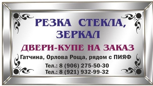 РЕЗКА СТЕКЛА И ЗЕРКАЛ в Гатчине и районе. Двери-купе на заказ. Стекольная мастерская предлагает стёкла и зеркала: - Оконное (4 мм) - Витринное (5, 6 мм) - Узорчатое стекло разных оттенков - Матовое, бронза - Зеркало 4 мм - Обработка кромки, сверление отверстий - Нанесение пескоструйного рисунка - Наклейка защитной пленки на зеркала для шкафов-купе - Наклеивание цветной пленки Oracal на стекло - Каленое стекло - ДВЕРИ-КУПЕ НА ЗАКАЗ Ленинградская область, г. Гатчина, Орлова роща, 3. Тел.: 8 (906) 275-50-30 Тел...