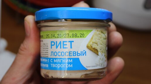 В "Пятерочке" по скидке купил за 99 рублей риет лососевый с мягким творогом, показываю, что внутри банки