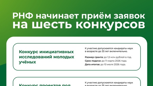 Российский научный фонд начинает приём заявок на шесть конкурсов, направленных на поддержку фундаментальных и поисковых научных исследований, а также проектов молодых учёных и научных групп. раздел «Конкурсы», страница rscf.ru/contests/, статус «Приём заявок» Смотри карточки, чтобы узнать детали ⬆️ Положения смотрите здесь: 🔹 Конкурс инициативных исследований молодых учёных Конкурсная документация доступна по ссылке Извещение о проведении конкурса доступно по ссылке 🔹 Конкурс проектов под руководством...