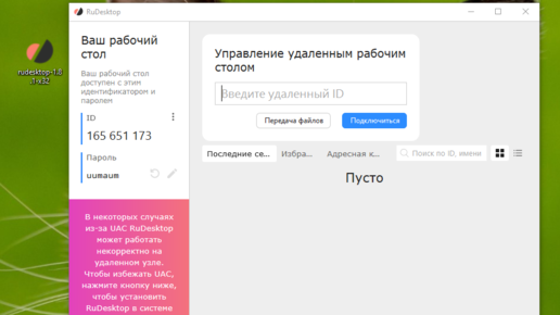 В предыдущей статье мы установили программу RuDesktop на свой ПК. На удаленном ПК мы запустили портативную версию данной программы. Итак, мы открыли утилиту RuDesktop (неважно какую: установочную или портативную). Программа RuDesktop Обращаем внимание на "Ваш рабочий стол" там содержится ID (идентификационный номер) и пароль для удаленного подключения к компьютеру. Программа RuDesktop Нажимаем на три точки рядом с ID нашего ПК. Программа RuDesktop У нас открывается контекстное меню. Программа RuDesktop...